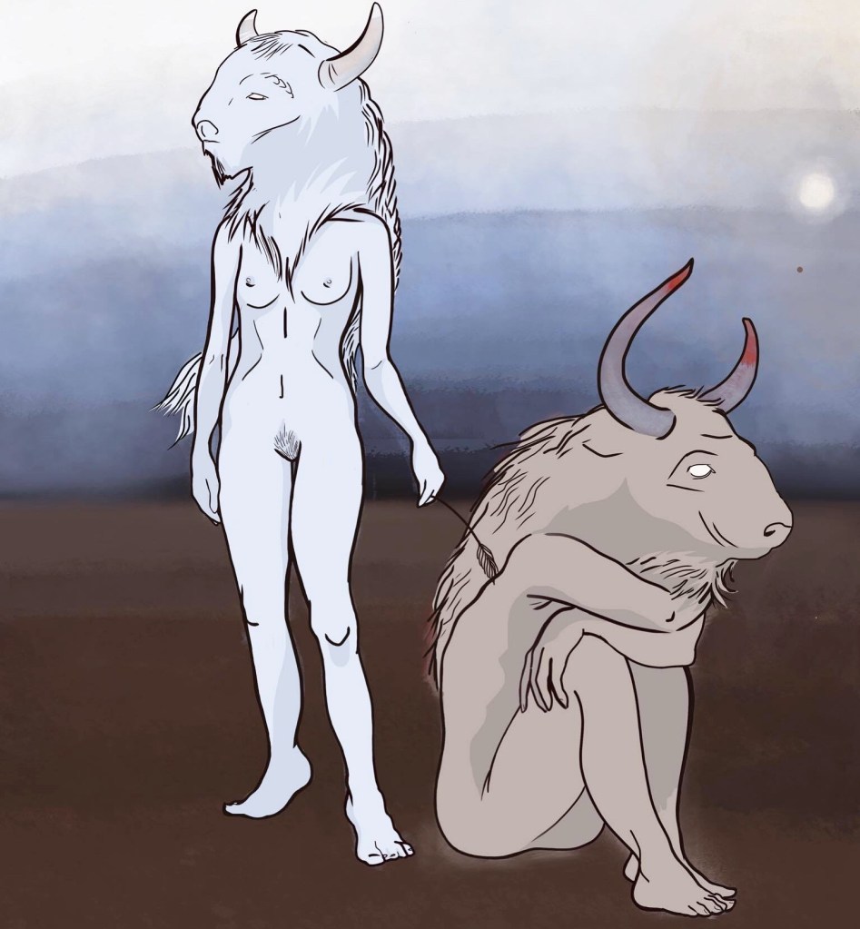 Listless minotaurs – this is a quick digital drawing of some pensive minotaurs. I was trying to create a sense of cold distance between them using the colours/ background, with varying degrees of success