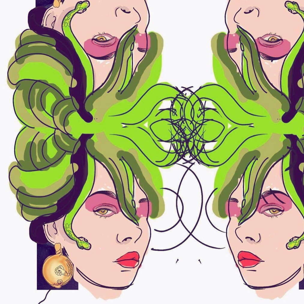 The final image combined a lot of elements; – nouveau style and gold-like details, vintage colour and aged, imperfect textures, a collage cut out face, and a bold modern aspirational composition- and by that I mean she’s meeting gazes with a side eye that suggests you wish YOU had a head of snakes.