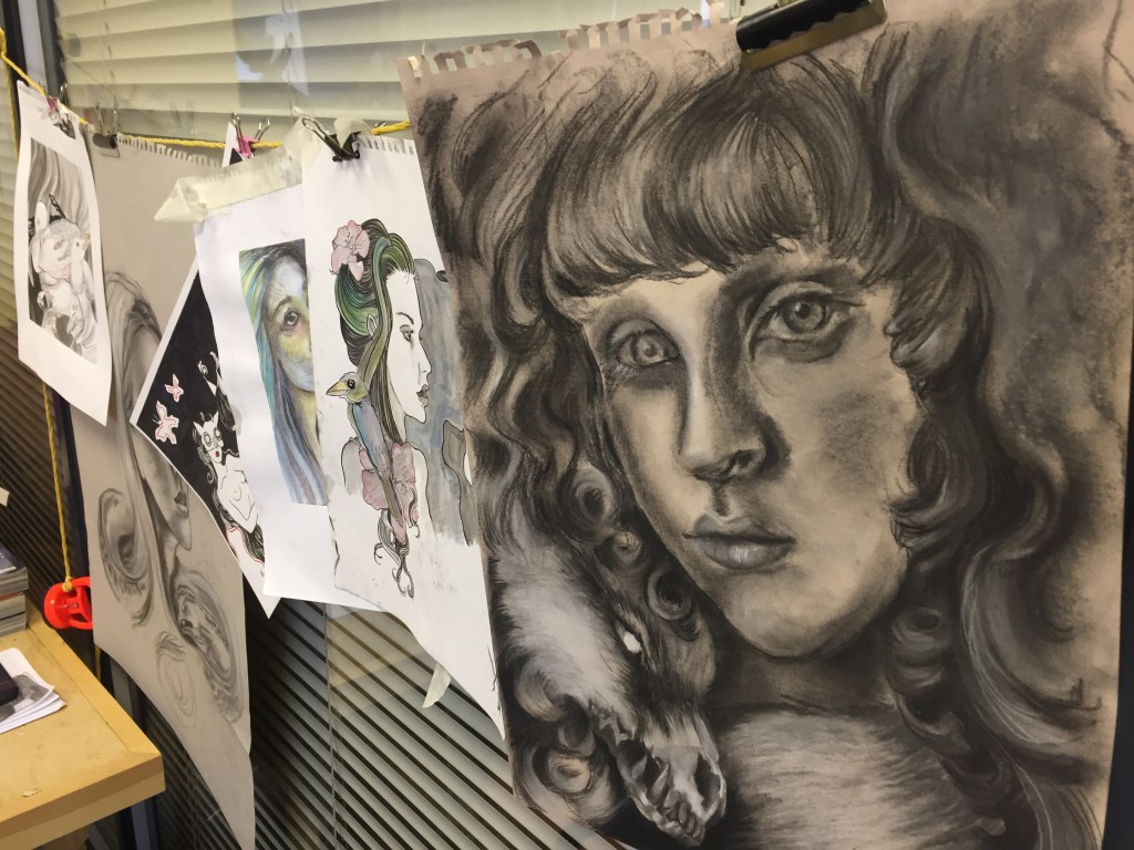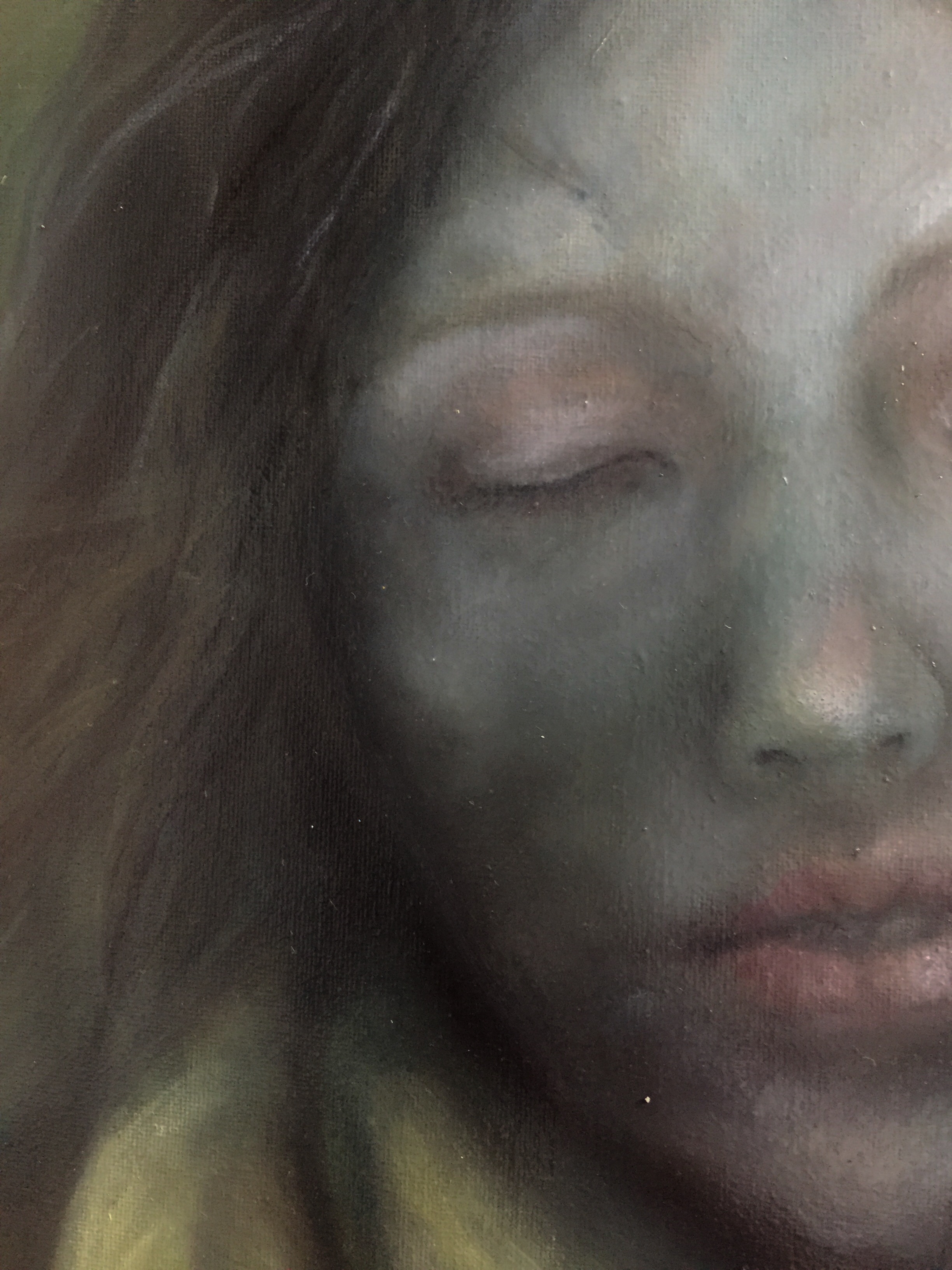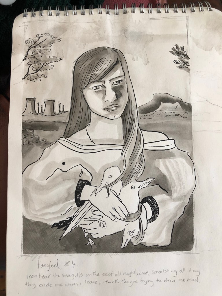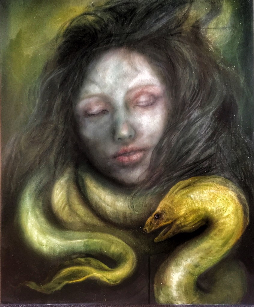I can’t remember the name of this painting – I finished it in time to be part of Pineapple Black galleries 2019 Summer Show (edit, I remembered) – it’s definitely a dark narrative, but she seems at peace with it at least