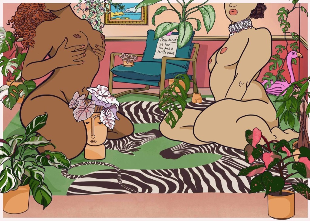 I opened up my ‘Do not sit on the chair’ illustration to feedback from a very dedicated and active online group – the uk Rare and Unusual Houseplants Facebook Group. I wanted their feedback on what plants my plant-loving naked ladies would have in the living room
