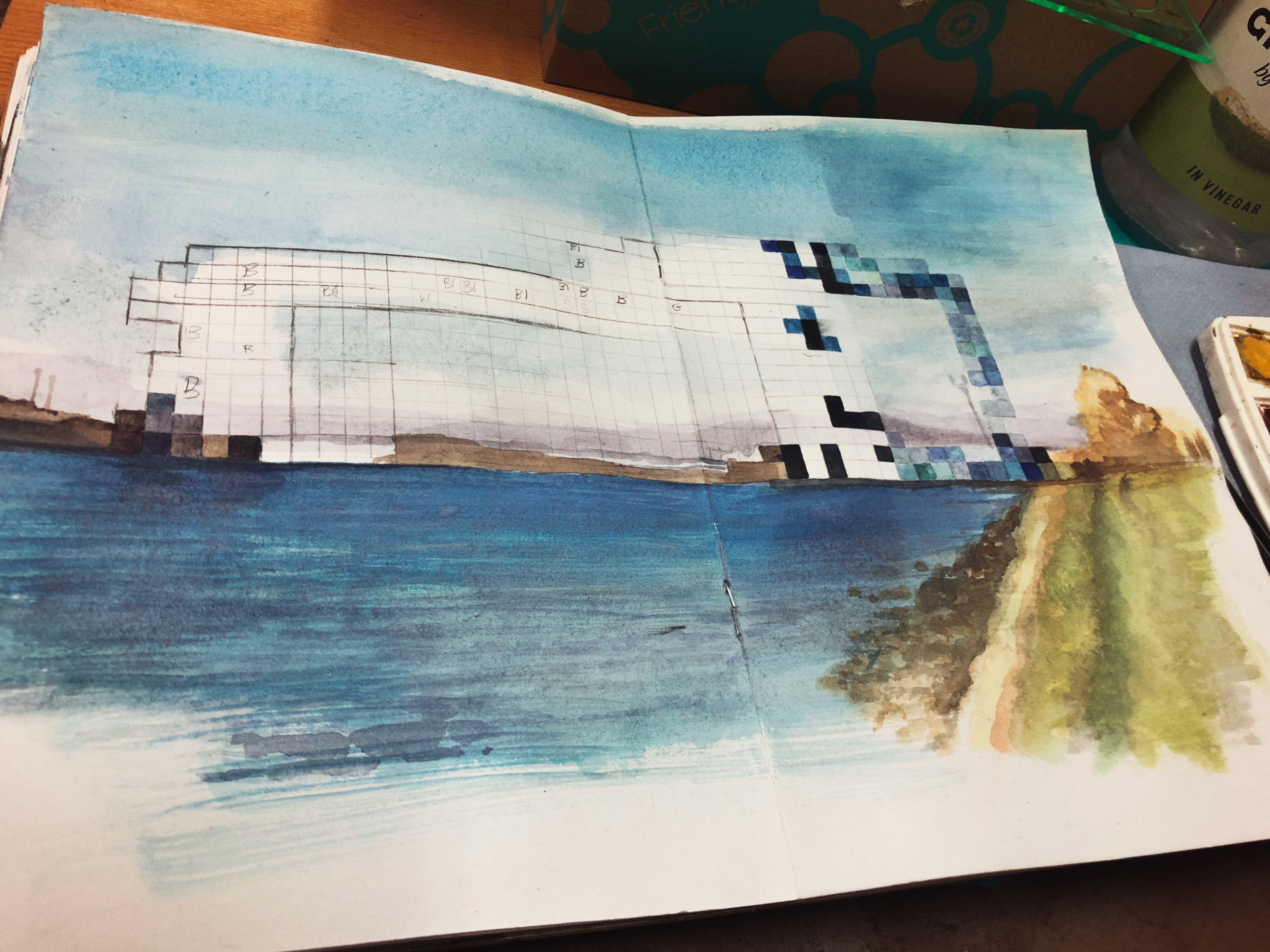 Included is The Dinosaur Park, my imagining of peg powler the river witch who lives in the tees, some underpasses, the old car scrapyard that mysteriously burnt down, the Transporter bridge pixelated out of the horizon, the abandoned office building I’m using as a studio, some seagulls, the Byron pub etc.