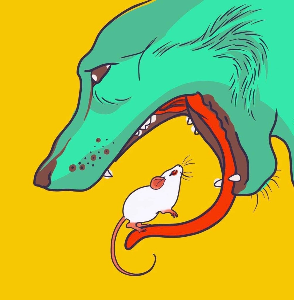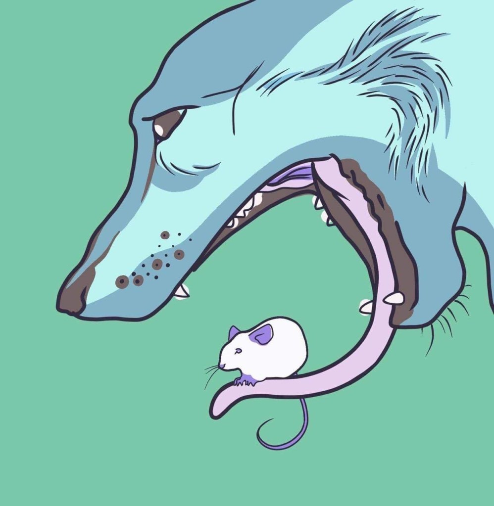 I have a few variations of the same basic idea, it changes from a fox/rabbit, fox/butterfly, then dog/mouse. Same concept – a stretched jaw devouring something delicate – the delicate thing being unconcerned about this fact.